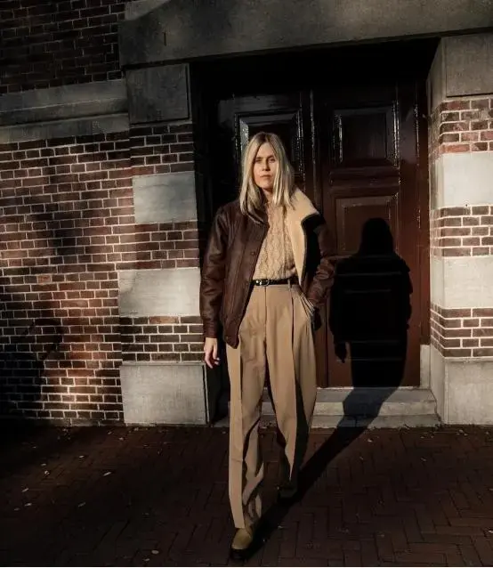 A dark brown leather short jacket paired with oatmeal suit wide-leg pants looks very smart and is very suitable for office workers. Wearing an oatmeal-colored sweater, tucked into pants and paired with a thin black belt will make your legs longer and more layered. The matching of the same color is also particularly high-end and textured.