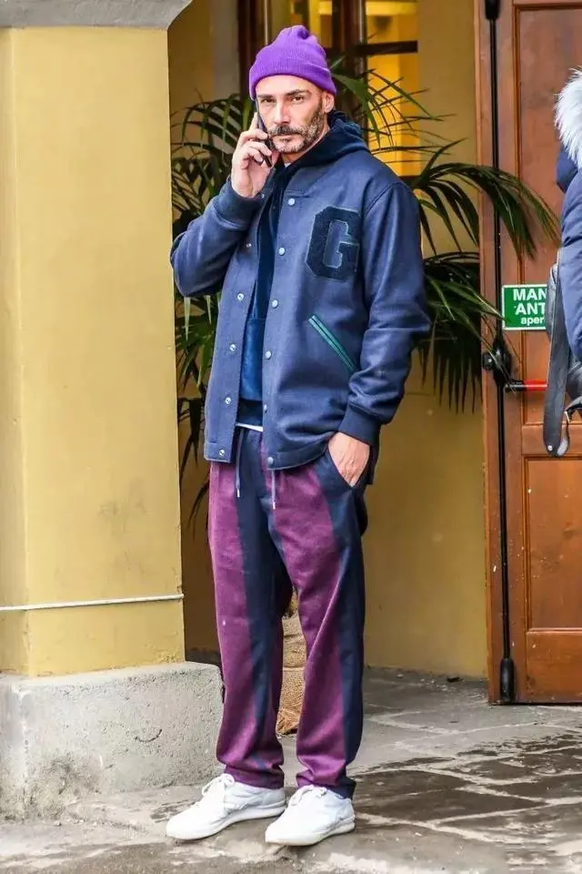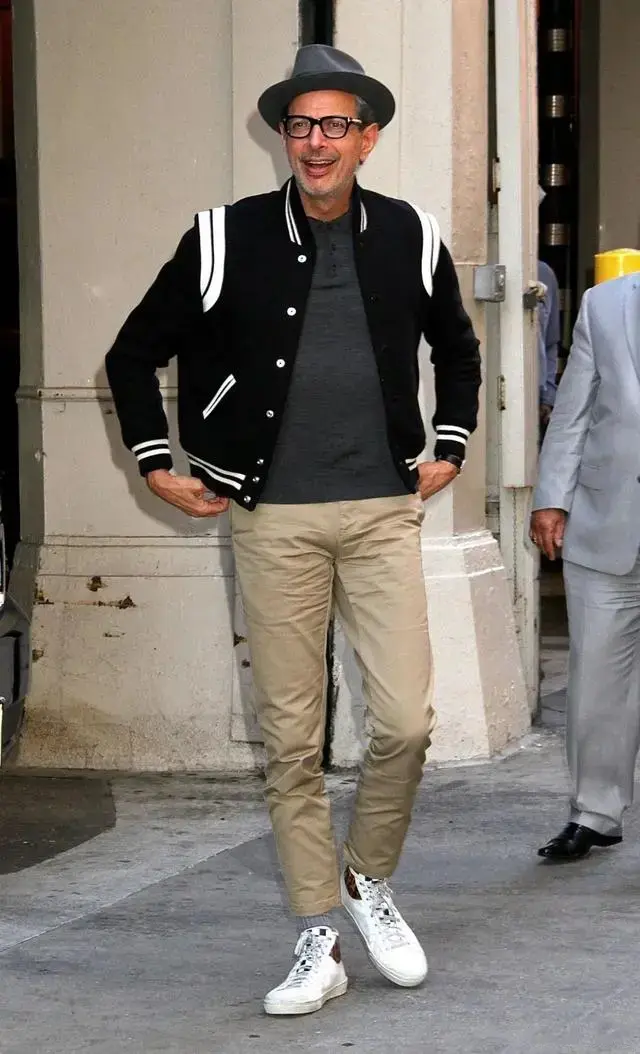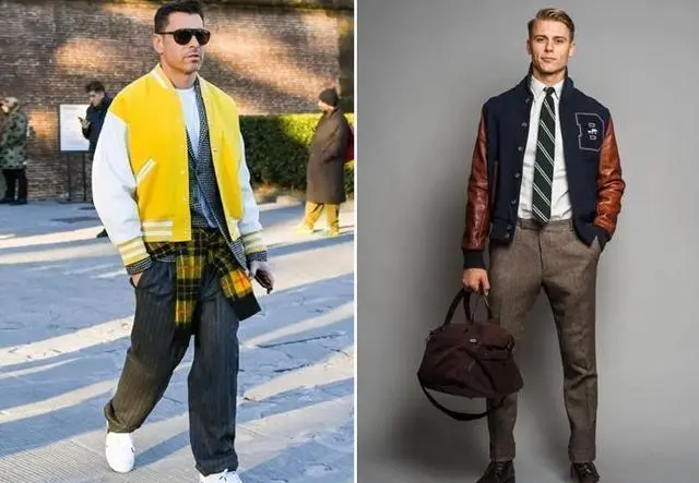 Pairing a baseball jacket with a formal suit is a mixed style style that best suits the aesthetics of a 40-year-old man.