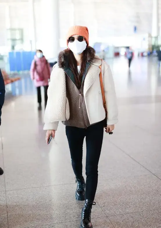Pair a white short jacket with black tights. The classic and simple black and white color scheme looks very high-end. It will look even more handsome when paired with a pair of Martin boots. You can layer a hooded knitted jacket under a short jacket, which will give you a more layered look and keep you warmer at the same time. Since both black and white are relatively low-key, you can pair it with an orange knitted hat, which will make it more fashionable, and wear an orange bag to echo it and make it more refined.