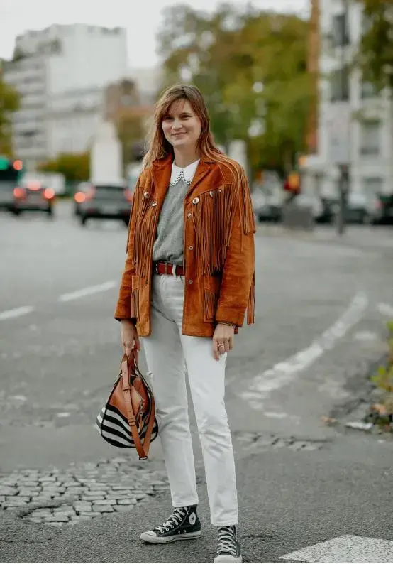 Knowledge point: Straight-leg pants are not too thick and can modify the shape of the legs, which can be said to be a very good choice. You can pair a brown short jacket with white straight pants. White can avoid the old-fashioned look brought by brown, and the contrasting color combination is also very eye-catching. Adding tassels to a short jacket will make it more personalized.