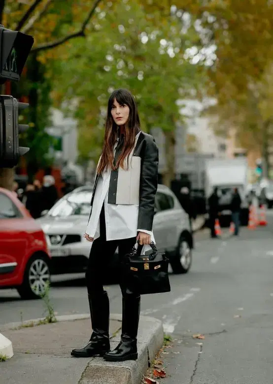 The short jacket with black and white splicing design will be more personalized. Wear a mid-length white shirt underneath. The shirt hangs casually, forming a staggered length with the short jacket, which is very layered. The lower body can be paired with black tights and black boots. Loose straight boots will make you look slimmer. It is very suitable for office workers. It is fashionable and personalized. It will look even better when paired with a handbag.