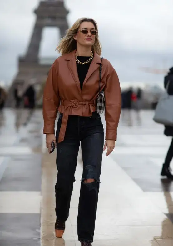 A brown short jacket and black ripped pants also go well together. The design of holes in the pants can effectively avoid the oppressive feeling of being stuffy and breathable, and will show flexibility. You can also tie a belt of the same color outside the short jacket to make it more personalized and fashionable. Using a gold necklace to brighten it can also have an eye-catching effect. A thicker necklace will be more in line with the overall dressing style and make it more handsome.