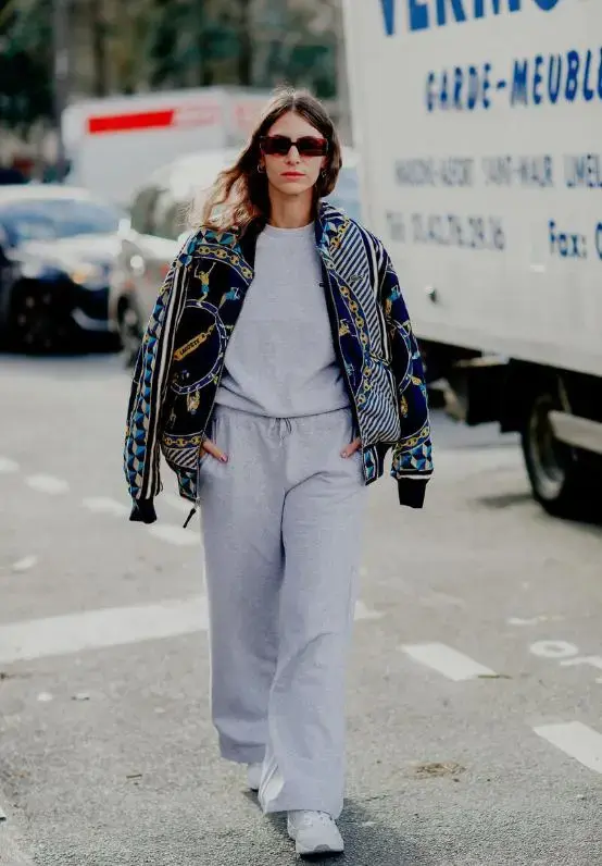 A fancy short jacket will look more comfortable paired with a solid color. You can choose gray sports wide-leg pants with a gray long-sleeved T-shirt, and a pair of white sneakers for a sporty yet casual look. Pure cotton fabric will be more comfortable. Tuck the hem of the T-shirt into the pants will make the legs longer. Just put the short jacket on the shoulders. It is very stylish and suitable for leisure or sports. .