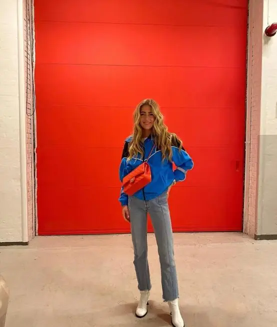 The sportswear-style short jacket looks youthful and energetic, and is also a very age-reducing choice. The dark blue loose short jacket looks white and looks younger. Paired with distressed nine-point jeans, it is a very personalized combination. Pairing it with a pair of white high-heeled boots will make it more elegant and can modify the lines of the ankles. Paired with a red crossbody bag, the contrasting color combination will be more eye-catching and personalized.