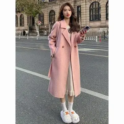 Pink double-sided cashmere coat for women 2023 new autumn and winter Korean style loose mid-length lace-up woolen coat